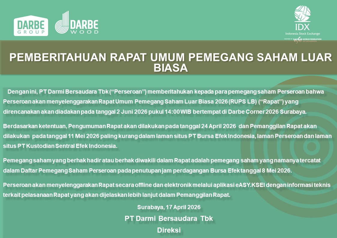 PT DARMI BERSAUDARA Tbk adalah Emiten Usaha Kecil dan Menengah (UKM) berorientasi ekspor, tercatat di Bursa Efek Indonesia sejak 4 Juli 2019 (IDX : KAYU)